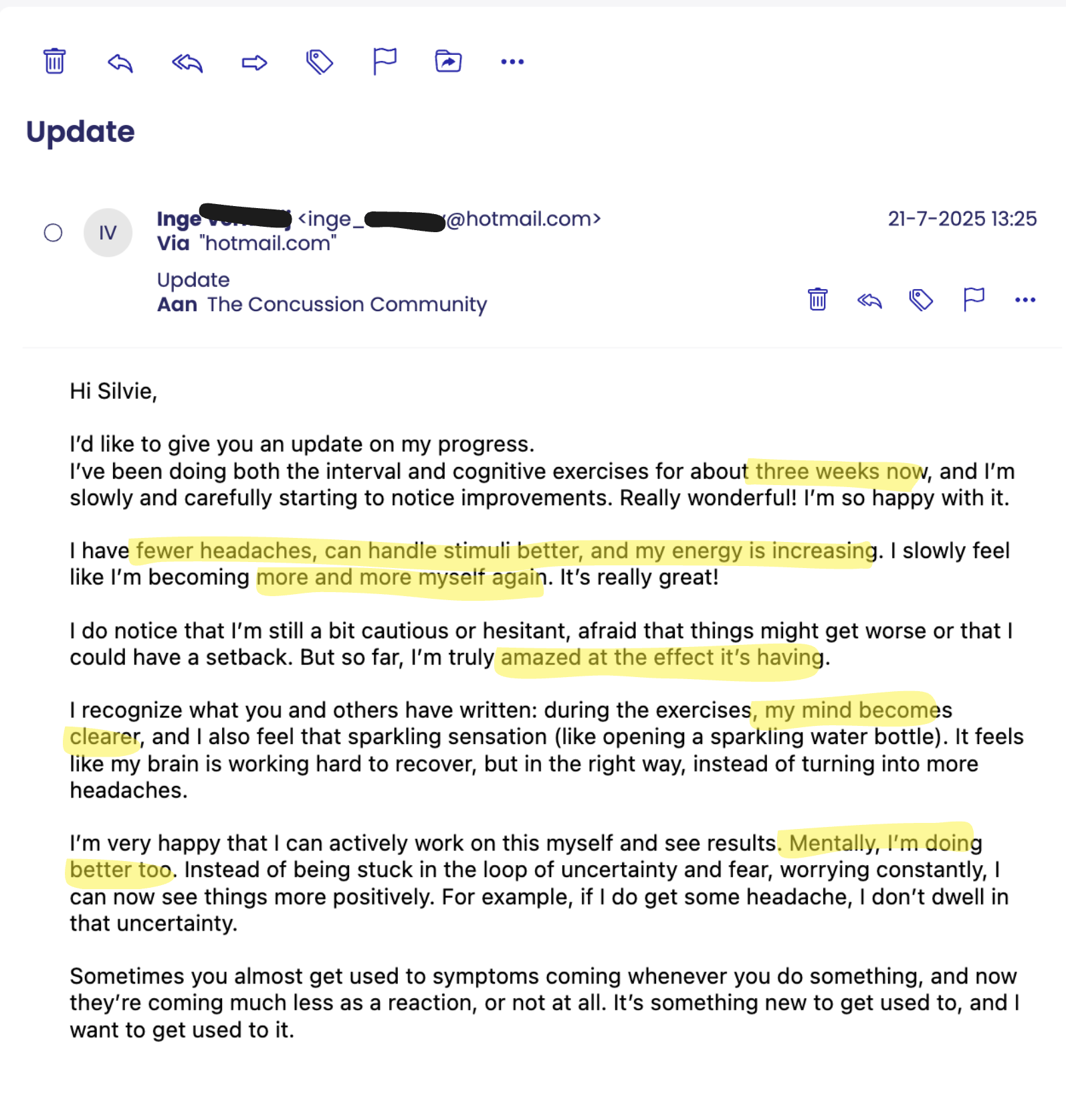 Hi Silvie, I just want to thank you for the advice to reduce the intensity of my training a bit. This week I had my best week so far. This week I will train twice and then three times the week after, and maybe I will stay at that level. I have adjusted my social routine with the intervals and neck exercises in breaks throughout the day. All my dizziness and headaches have disappeared, and I fall asleep much later in the day now, around the time I eat with the family.