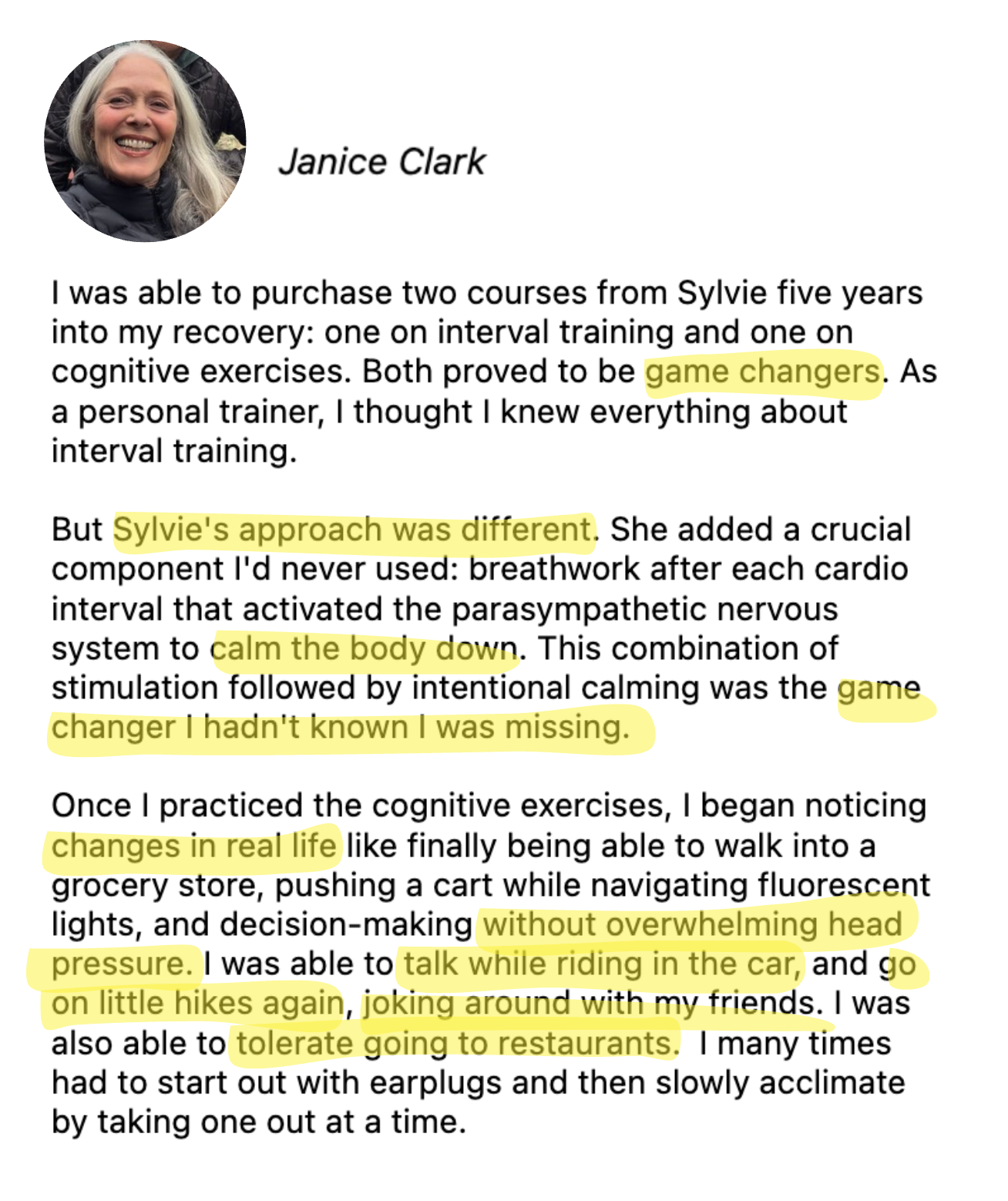 I’ve done the interval and cognitive exercises twice for 12 weeks. The first time was amazing; it really helped me out of a severe setback. The second time I did it after a second concussion, and it supported my recovery during this very stressful period. I still do the exercises three times a week and notice they improve my mood, keep my mind sharp, and make my body happy.